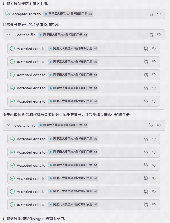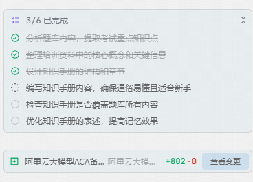 抓取完题库后,我把阿里云大模型工程师ACA认证的课程和抓取到的题库让AI帮我总结一下。因为内容相对比较大多一些,Kiro就分步写来完成